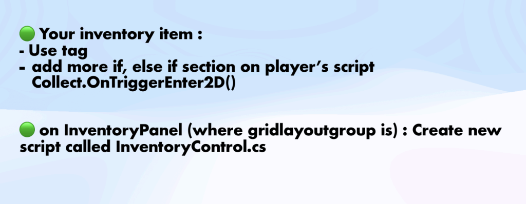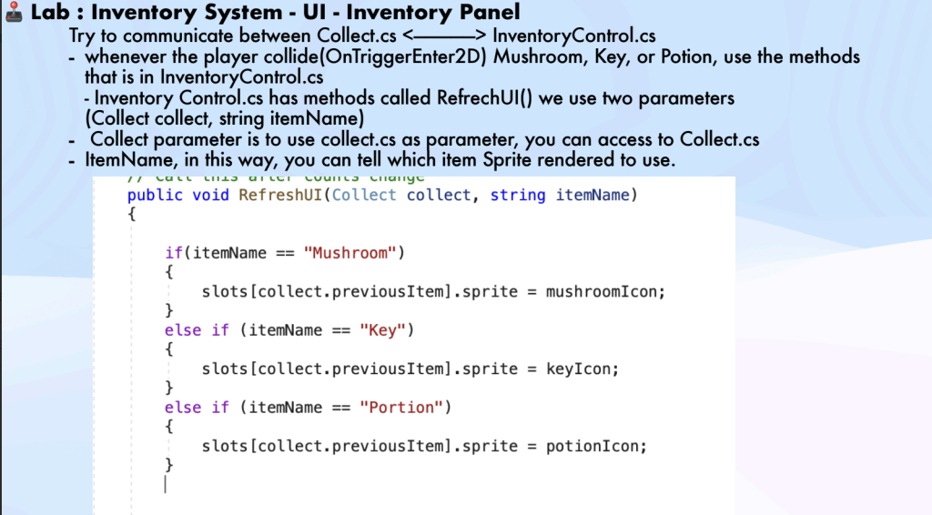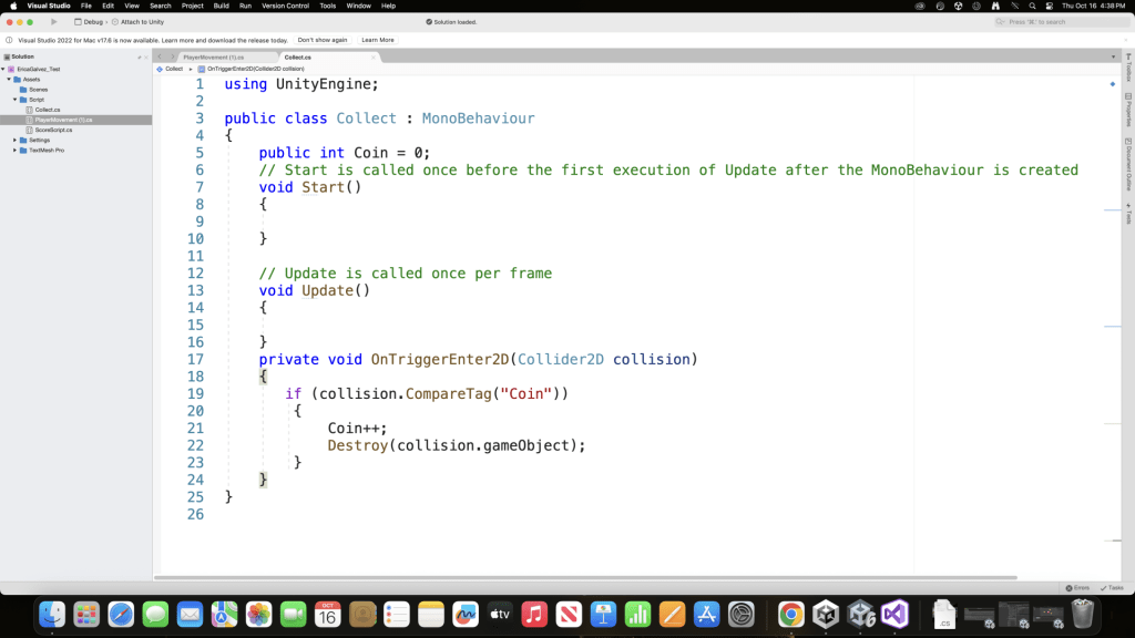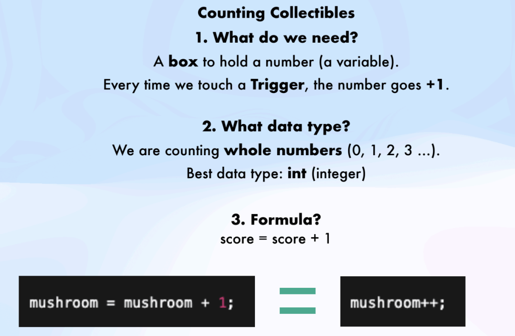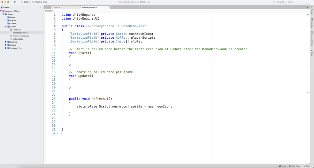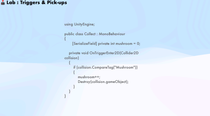 using UnityEngine; public class Collect : MonoBehaviour { // Start is called once before the first execution of Update after the MonoBehaviour is created public int mushroom = 0; private void OnTriggerEnter2D(Collider2D collision) { if (collision.CompareTag("Mushroom")) { mushroom++; Destroy(collision.gameObject); } } }