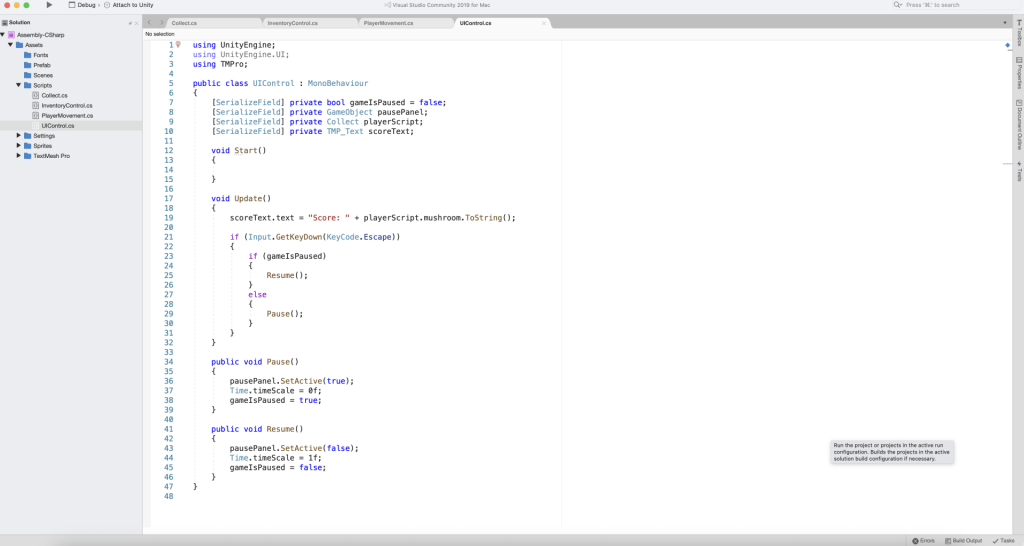 using UnityEngine; using TMPro; public class HUDController : MonoBehaviour { [SerializeField] private Collect player; [SerializeField] private TMP_Text ScoreText; // Start is called once before the first execution of Update after the MonoBehaviour is created void Start() { if (player == null) { player = FindObjectOfType<Collect>(); } if (ScoreText == null) { ScoreText = GetComponentInChildren<TMP_Text>(); } } // Update is called once per frame void Update() { if (player != null && ScoreText != null) { ScoreText.text = "Score: " + player.mushroom.ToString(); } } }
