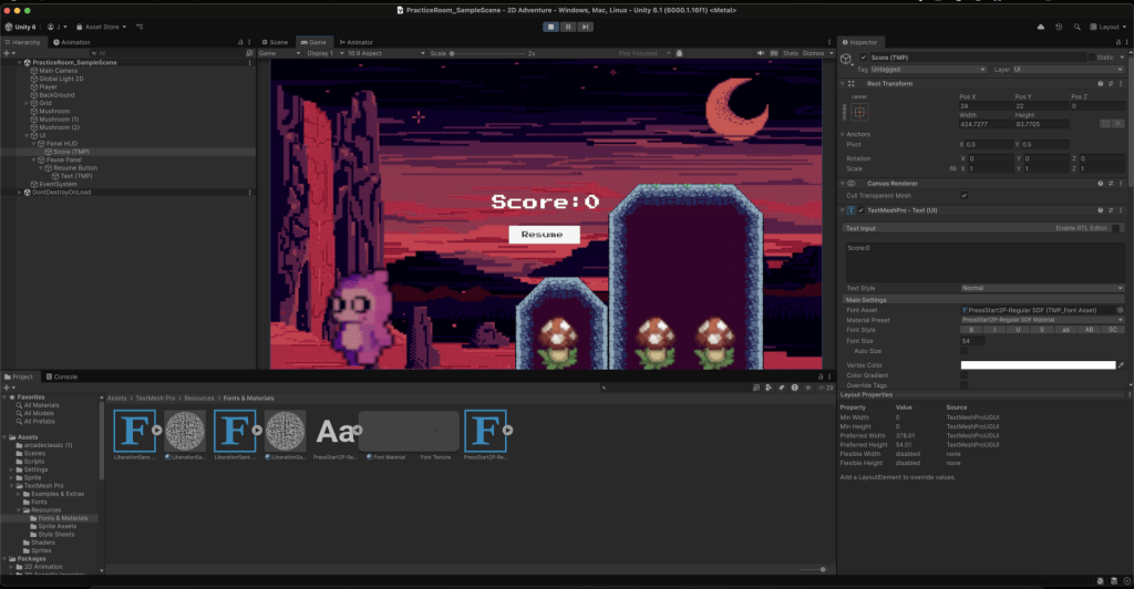 using UnityEngine; using TMPro; public class HUDController : MonoBehaviour { [SerializeField] private Collect player; [SerializeField] private TMP_Text ScoreText; // Start is called once before the first execution of Update after the MonoBehaviour is created void Start() { if (player == null) { player = FindObjectOfType<Collect>(); } if (ScoreText == null) { ScoreText = GetComponentInChildren<TMP_Text>(); } } // Update is called once per frame void Update() { if (player != null && ScoreText != null) { ScoreText.text = "Score: " + player.mushroom.ToString(); } } }