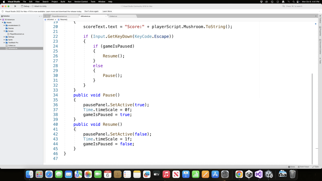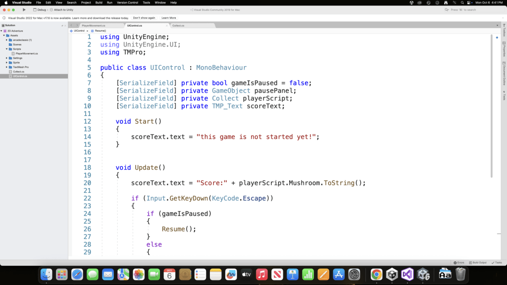 using UnityEngine; public class Collect : MonoBehaviour { // Start is called once before the first execution of Update after the MonoBehaviour is created public int mushroom = 0; private void OnTriggerEnter2D(Collider2D collision) { if (collision.CompareTag("Mushroom")) { mushroom++; Destroy(collision.gameObject); } } }